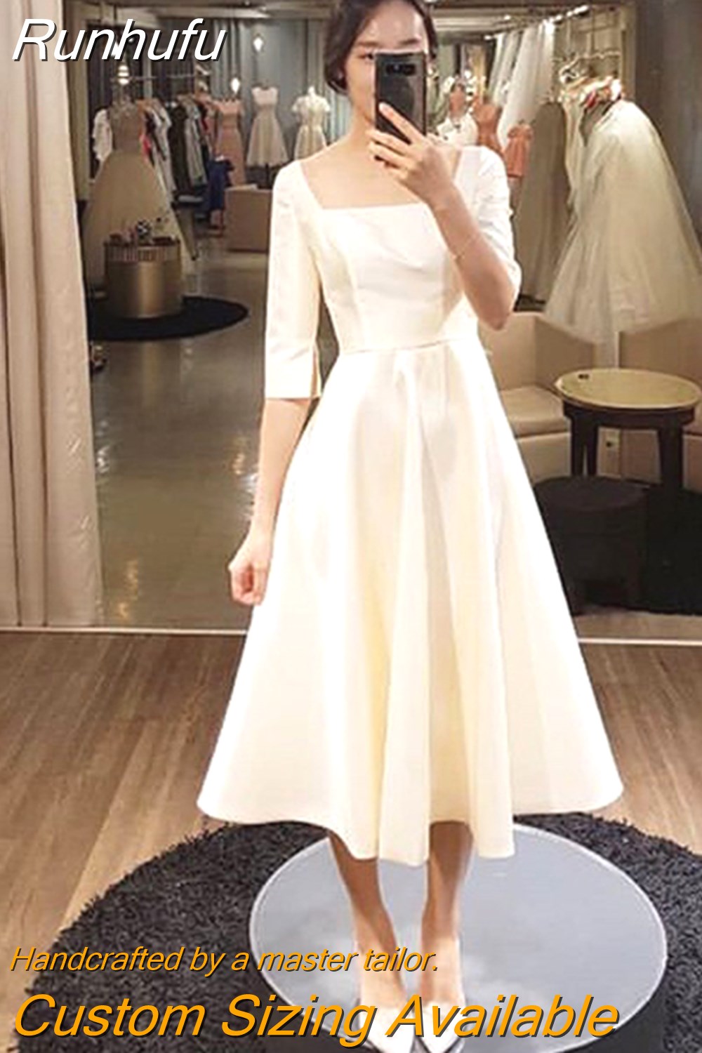 Half Sleeves Short Wedding Dress 2023 Mid-Calf Satin Korea Party Gowns Square Collar Neck Vestido De Novia Cheap Simples